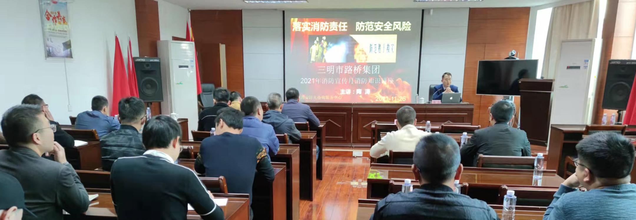 在培訓會中,市交通執法支隊質監站副站長徐木旺針對集團業務開展類型,對福建省公路水運工程質量安全監督條例和普通公路標注化施工管理進行了深入淺出的講解,并逐一解答了參會人員提出的問題;三明消安防火咨詢服務中心主任教師陶濤通過播放消防短片以及課件,詳細講解了消防安全應知應會知識,結合典型火災例案,生動細致的分析了如何有效預防火災事故的發生及講解演示了火場中如何正確逃生自救和互助互救法的方式方法。