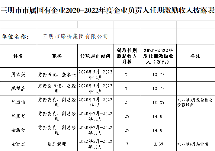 三明市路橋集團有限公司2020-2022年度企業負責人任期激勵收入披露