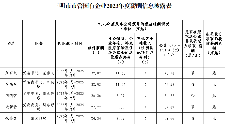 三明市路橋集團有限公司2023年度企業負責人薪酬信息披露