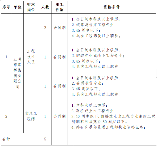 (二)報名。采取網絡報名方式,請應聘者下載填寫《三明市路橋集團有限公司公開招聘工作人員報名登記表》(附件),投遞至郵箱smslqjt@163.com(文件命名為“姓名+應聘崗位”)。報名截止時間為2022年7月8日。