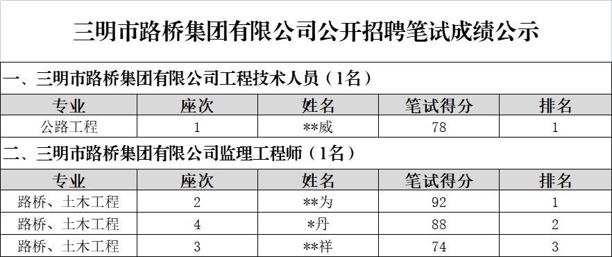 市路橋集團公開招聘筆試環節已于2022年8月23日完成,現將筆試成績予以公示: