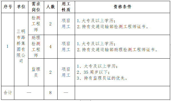 (一)公告。招聘崗位、人數(shù)、任職資格等信息在 “三明市路橋集團”官網(wǎng)(www.weifangyoubang.com)“一覽英才網(wǎng)”官網(wǎng)向社會統(tǒng)一公告。