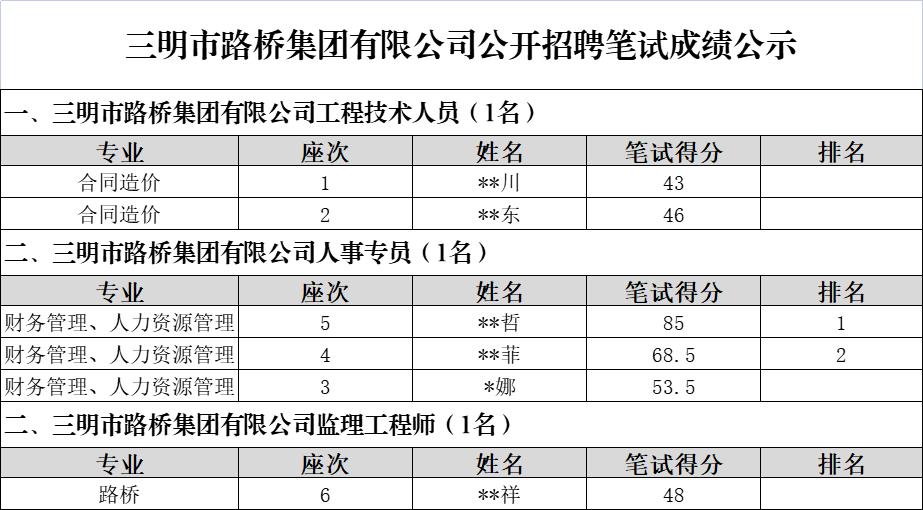 市路橋集團公開招聘筆試環節已于2022年10月11日完成,現將筆試成績予以公示: