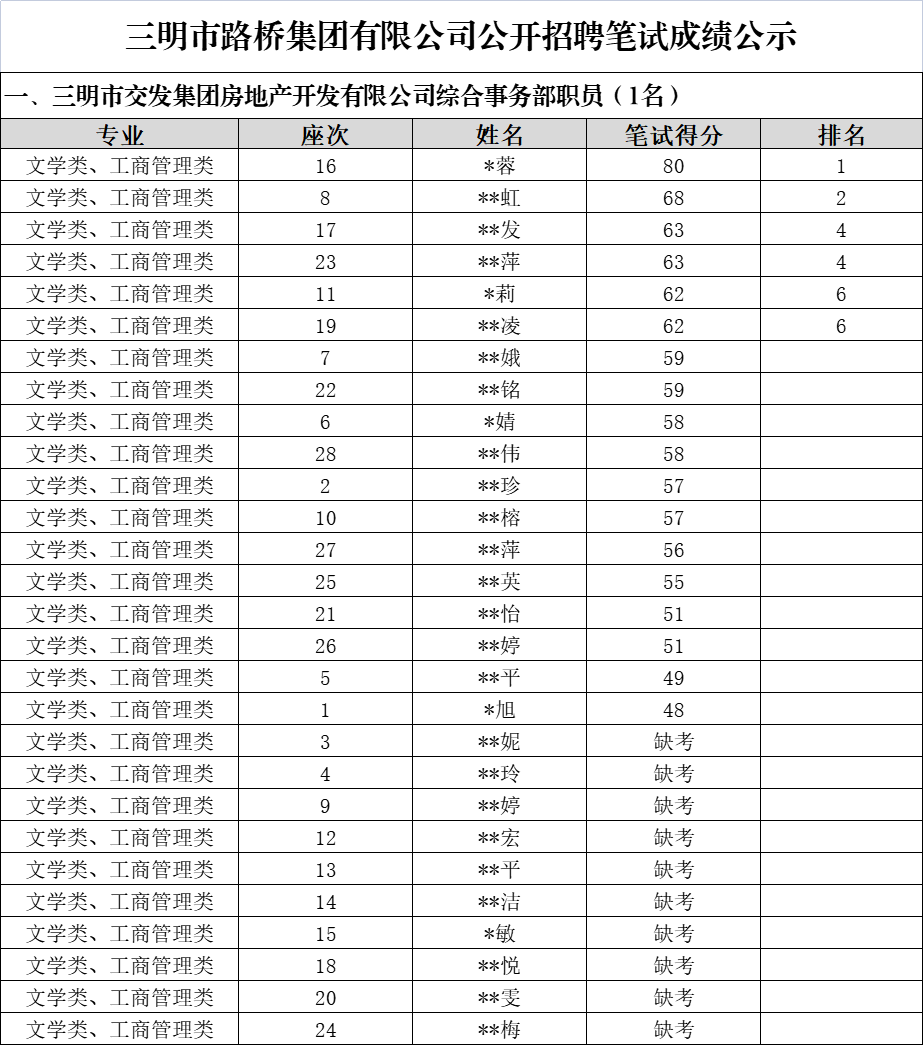 市路橋集團公開招聘筆試環節已于2022年12月1日完成,現將筆試成績予以公示: