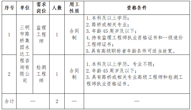 (一)公告。招聘崗位、人數、任職資格等信息在 “三明市路橋集團”官網(www.weifangyoubang.com)向社會統一公告。