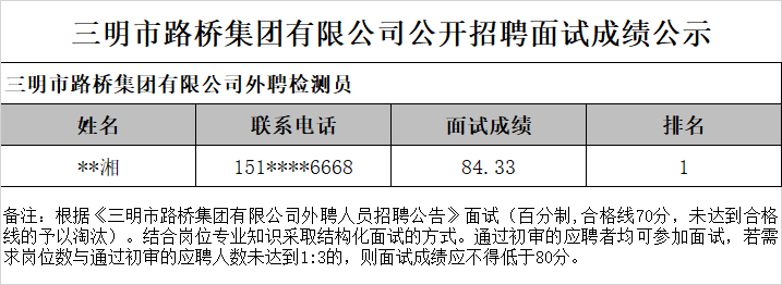 市路橋集團(tuán)永達(dá)工程咨詢有限公司外聘人員招聘面試環(huán)節(jié)已于2023年8月14日完成,現(xiàn)將面試成績予以公示: