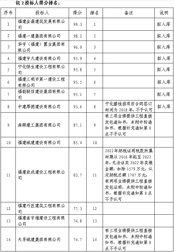 評標委員會對通過資格審查的各合格投標人,按合同包根據遴選文件規定進行評分。各投標人經評標委員會綜合分析、比較,在全部滿足遴選文件實質性要求前提下,按得分從高到低的順序進行排名,排名最高的前8名投標人將被推薦為相應合同包的入庫候選人;具體為:包2為房建工程類,排名前8名的三明市域企業入庫;若企業得分相同,則以企業信用分得分高的排名優先。再相同的,依次以業績得分、資質得分、繳交稅收金額高的排名優先。