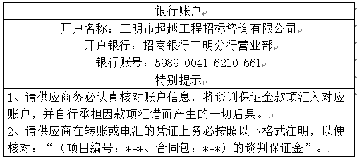 6.2采購文件發售地點:三明市超越工程招標咨詢有限公司(地址:三明市三元區東乾路192號(匯鑫大廈)2606號)購買或將購買費用轉賬至以下賬戶: