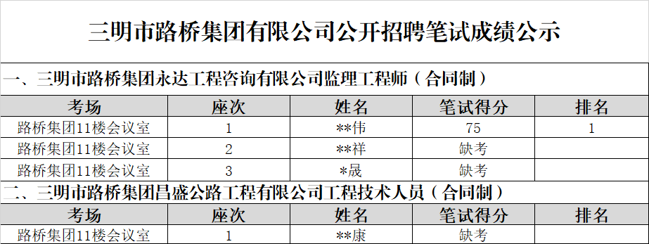 市路橋集團公開招聘筆試環節已于2025年10月22日完成,現將筆試成績予以公示: